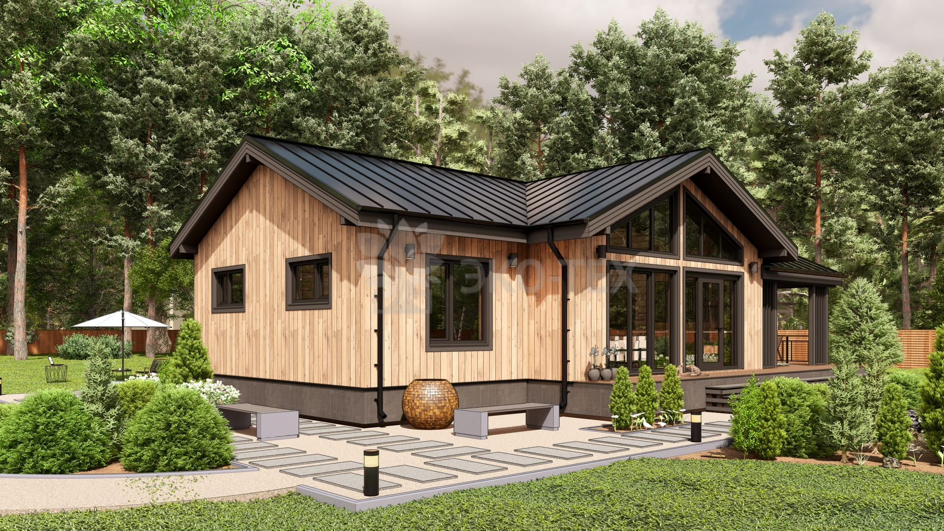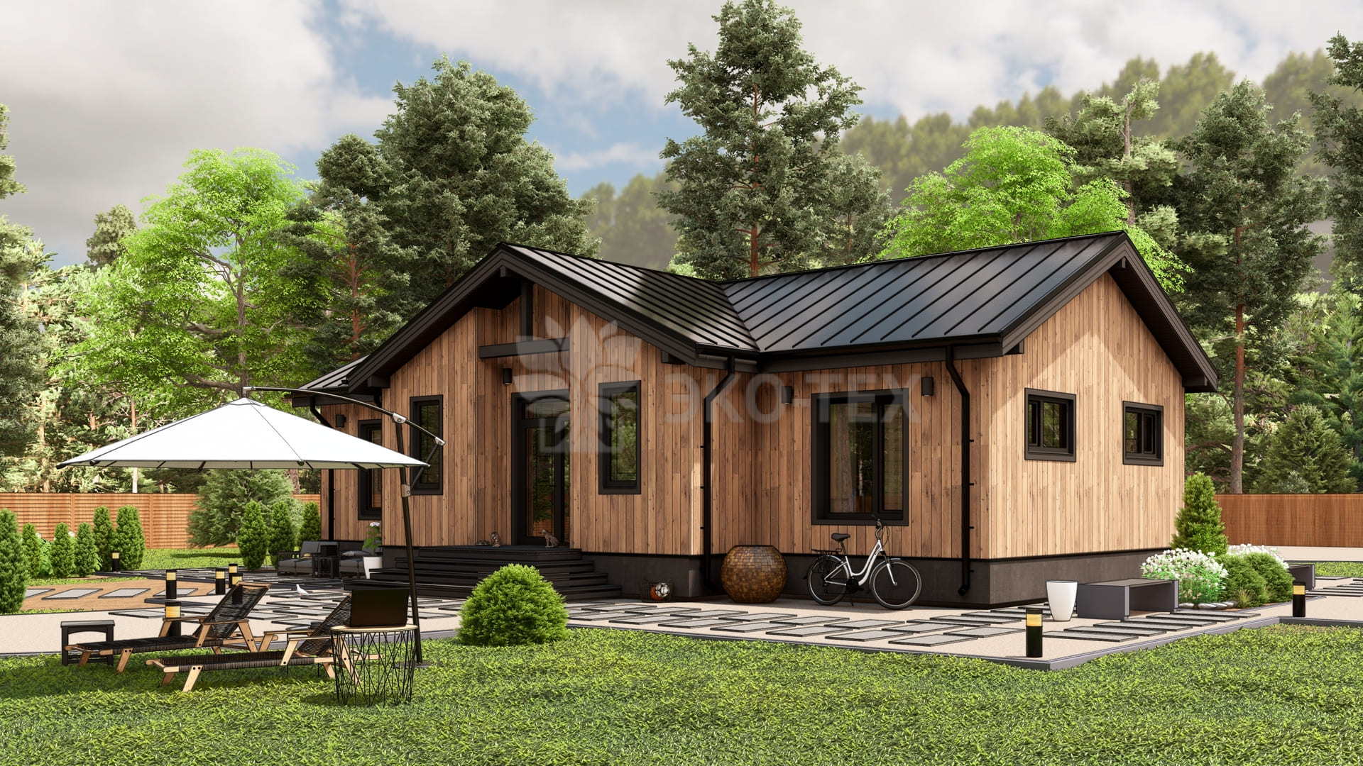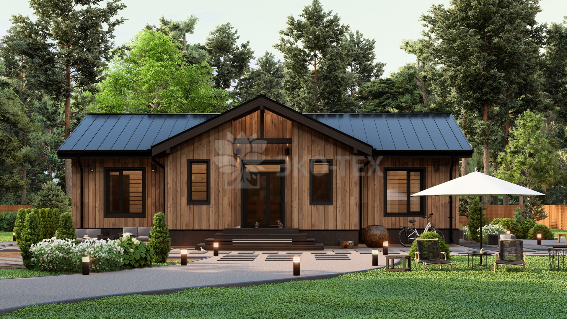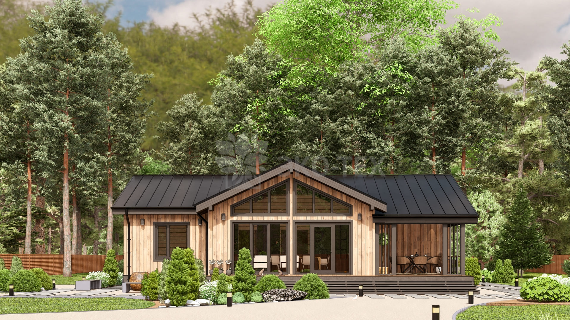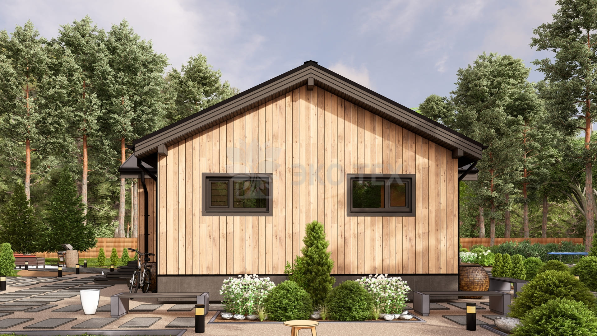 Каркасный дом для постоянного проживания c кровлей металлочерепица, отделка, окна, фундамент железобетонные сваи сечение 150*150 мм, L (длина) - 3 000 мм
