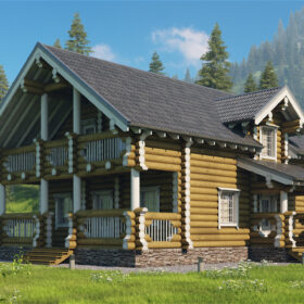 Двухэтажный дом с террасой, балконом, материал оцилиндрованное бревно