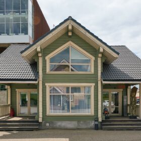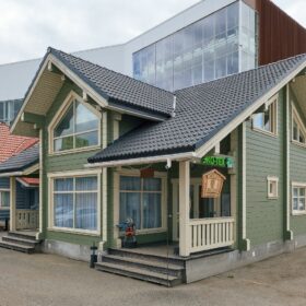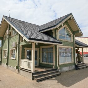 На площадке представлены 4 дома: дом из оцилиндрованного бревна по проекту «Заречье», дом из клееного бруса по проекту «Победа», баня из бревна ручной рубки и небольшой домик из клееного бруса.